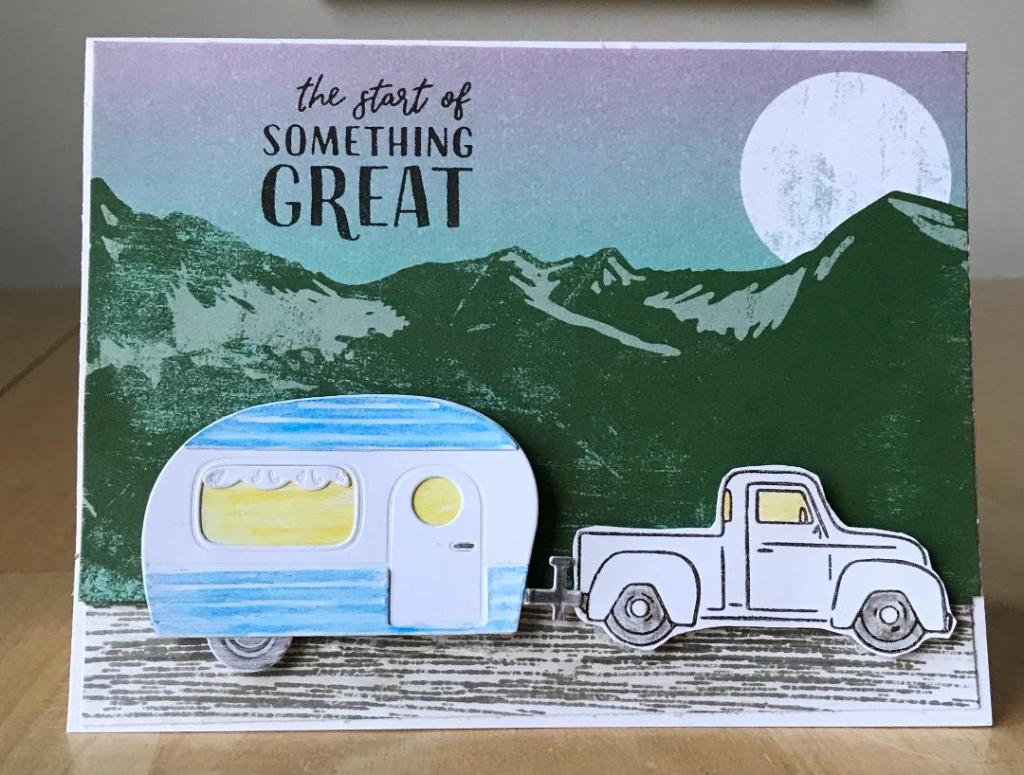 For the camping/travel trailer enthusiasts…this is the season we wait for all year long! This delightful card is my own creation using Stampin’ Ups: Enjoy the Journey Designer Series Paper #160586; Trucking Along Stamp set #162299; Tree Lot Dies #159938 and the sentiment is part of a larger sentiment text from Greatest Journey #160588.