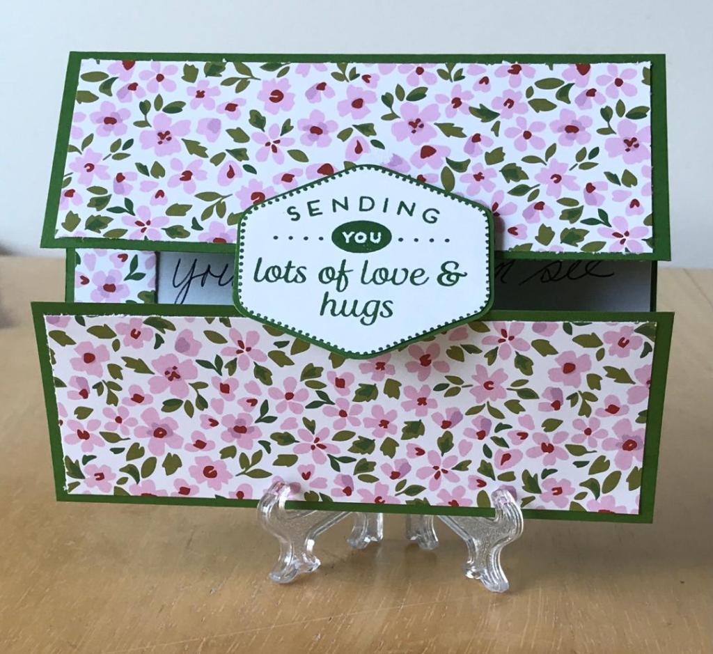 The card is cut 8-1/2 x 5-1/2 and scored at 2-1/8 on both of the 8-1/2″ sides. The focal point is stamped and punched using the Heartfelt Hexagon Stamp and Punch bundle #162889 and mounted on dimensionals. Stampin’ Up’s! pretty designer paper Delightfully Eclectic #161640 is artfully placed on Garden Green Cardstock as shown.
