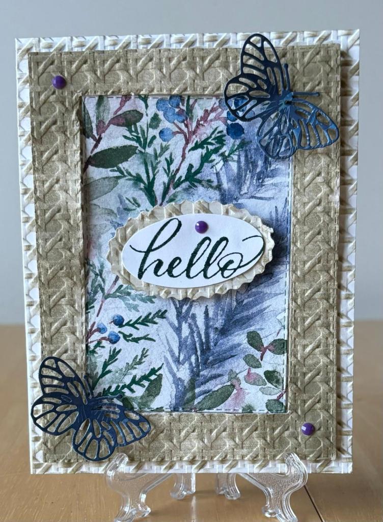 The first layer is the front of the white card base which has been embossed with the Cane Weave Embossing folder then lightly colored with a sponge dauber. The second layer uses a frame cut from rectangle dies which is then embossed with the Cane Weave Embossing folder that has been fully colored with the matching ink. The butterflies were made using the Brilliant Wings Dies set listed below.