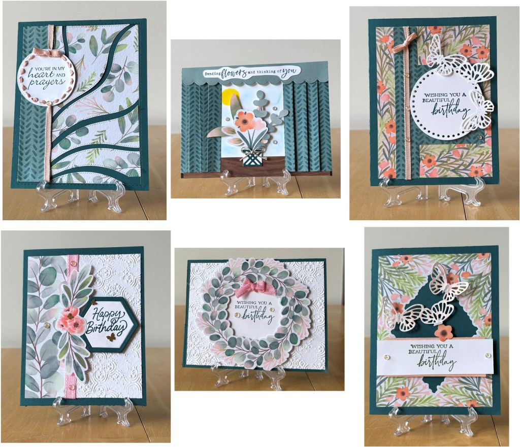 These cards are my own design. From top left to bottom right, cards 1, 3, 4, and 6 are made using a standard cardbase of 8-1/2″ x 11″ scored at 4-1/4″ with a left side fold. Cards 2 and 5 and made using a card base cut at 4-1/4″ x 11″ scored at 5-1/2″ with a left side fold. Card #2 features my own adaptation of the paper fold that is often called the curtain or drapery fold and the sentiment is cut out using the Brother Scan ‘n Cut machine model #SDX125