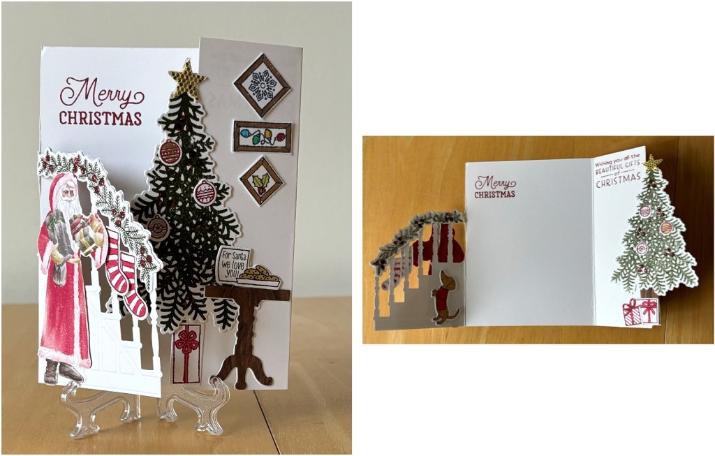 This card is my own design. Card base uses the standard 8-1/2″ x 11″ Card stock. Cut the card stock to 5-1/2″ tall x 11″. Score the 11″ side at 3″ and 7-1/4″. Use Staircase dies to cut left-side flap of card as shown. Use the Tree die in Christmas Staircase to partially cut the Christmas tree on the right-side flap. Reverse stamping and partial die cutout techniques are used to make a double-sided tree and staircase garland. Fold inward creating a modified overlapping gatefold card.