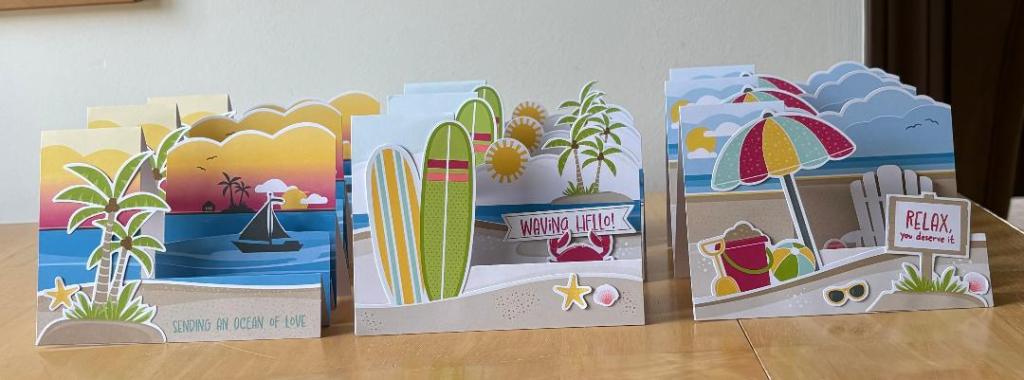 This was the July 2023 Paper Pumpkin kit called “Fun in the Sun”. This is a fun-fold design sized at 5-1/2″ x 4-1/4″ and fits conveniently in the standard A2 envelope. The cards were made almost exactly as specified.