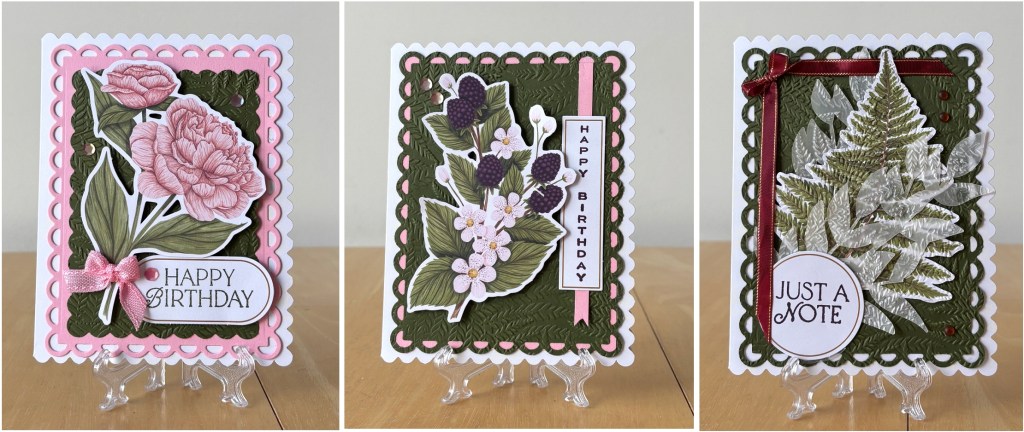 These cards are my own design. Each card uses the card base provided in the “Notes From the Heart” Paper Pumpkin December 2024 kit and is designed portrait style with a left side fold.