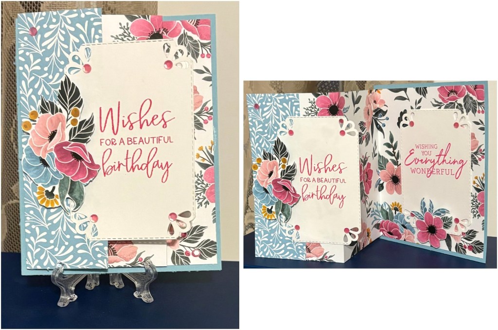 This card is my own design created using a standard card base of 8-1/2 x 5-1/2 inches scored at 4-1/4″ with a left side fold.